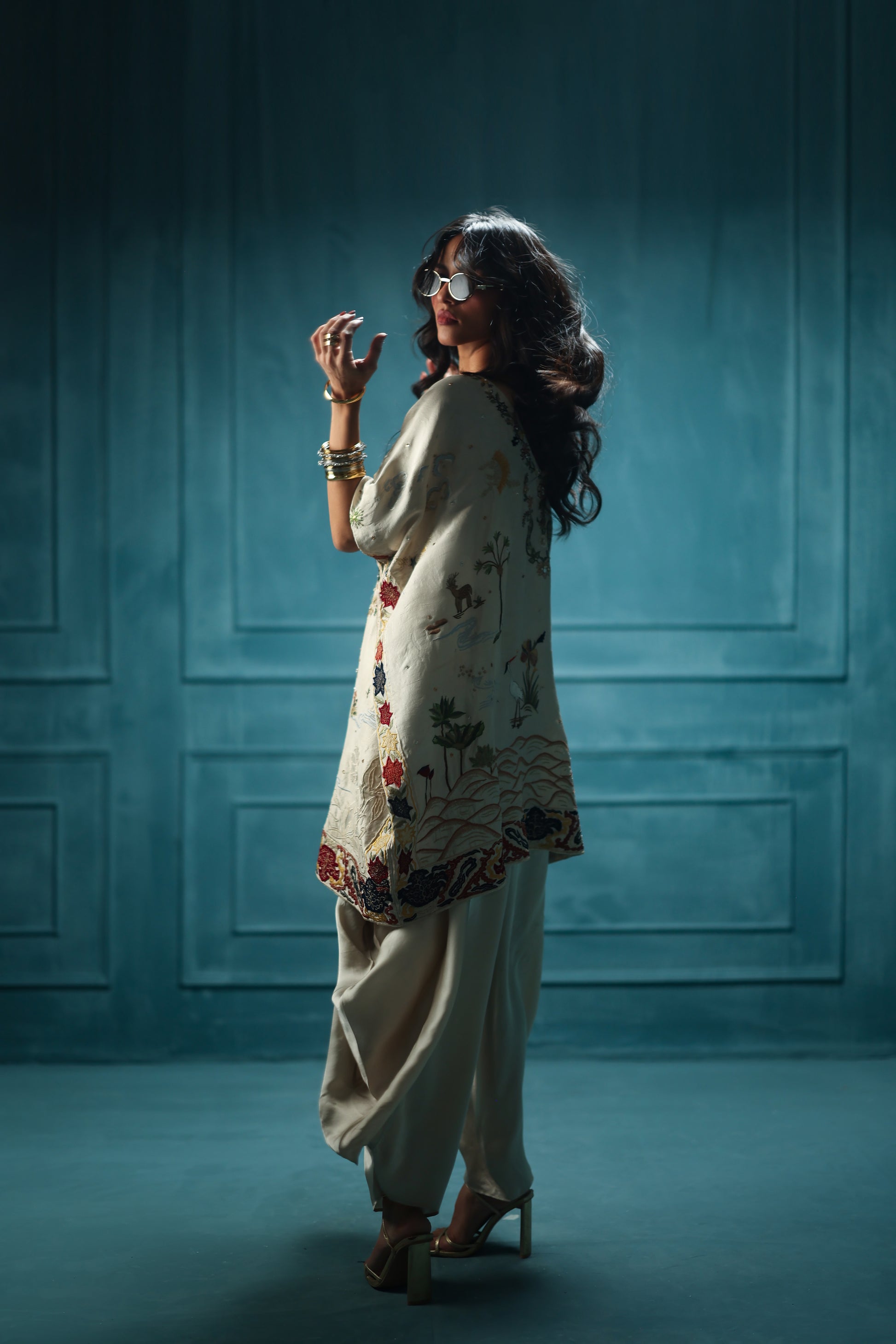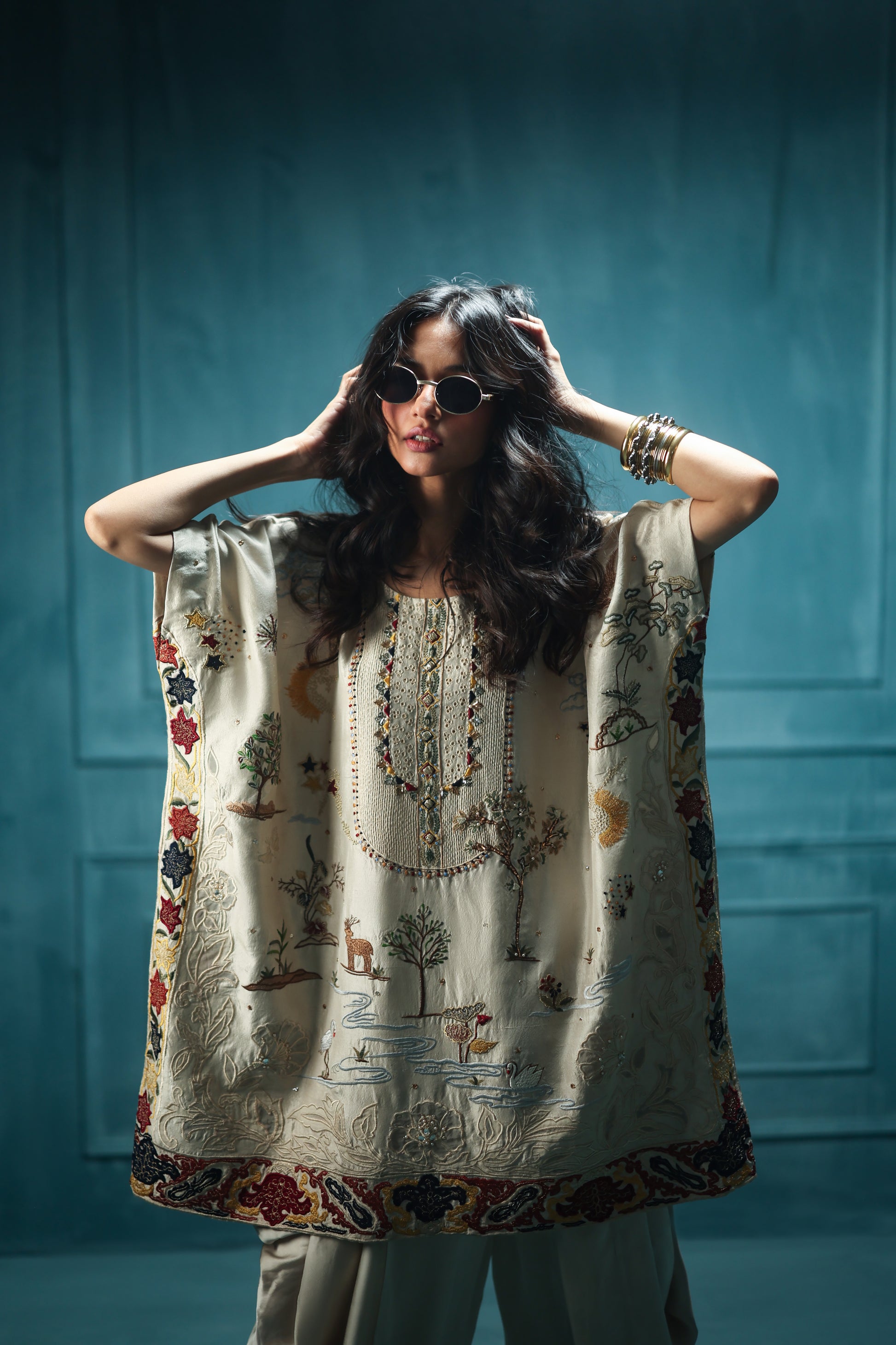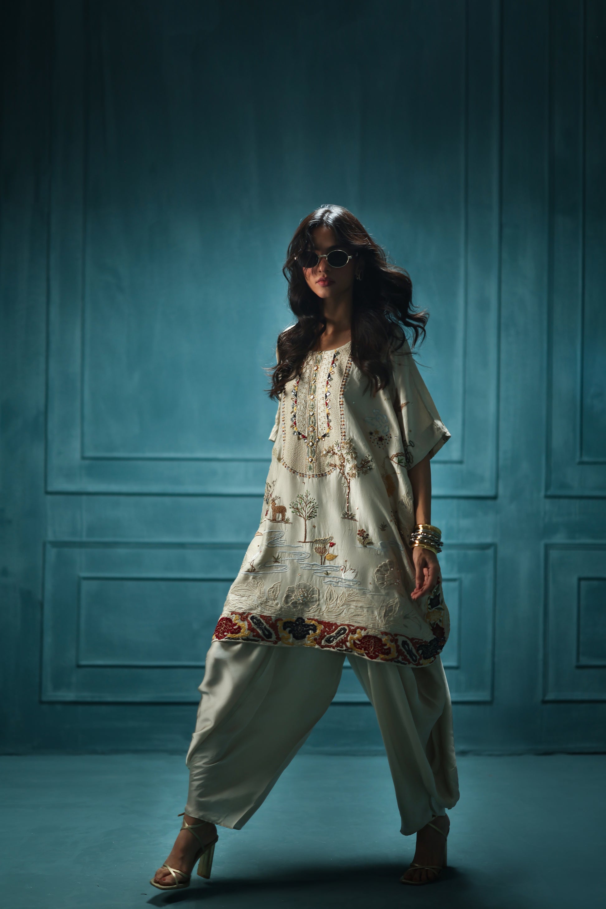 A poetic ode to craft, this short kurta, cut in relaxed silhouette, unfolds on a dusky almond, intricately embroidered with ornate details and majestic scenes from shikargah, elevated by resplendent threadwork, gilded detailing at the neckline lends a subtle radiance. A beautiful, bold applique detail sits upon a framed unique patchwork border paired with charmeuse cowl shalwar.